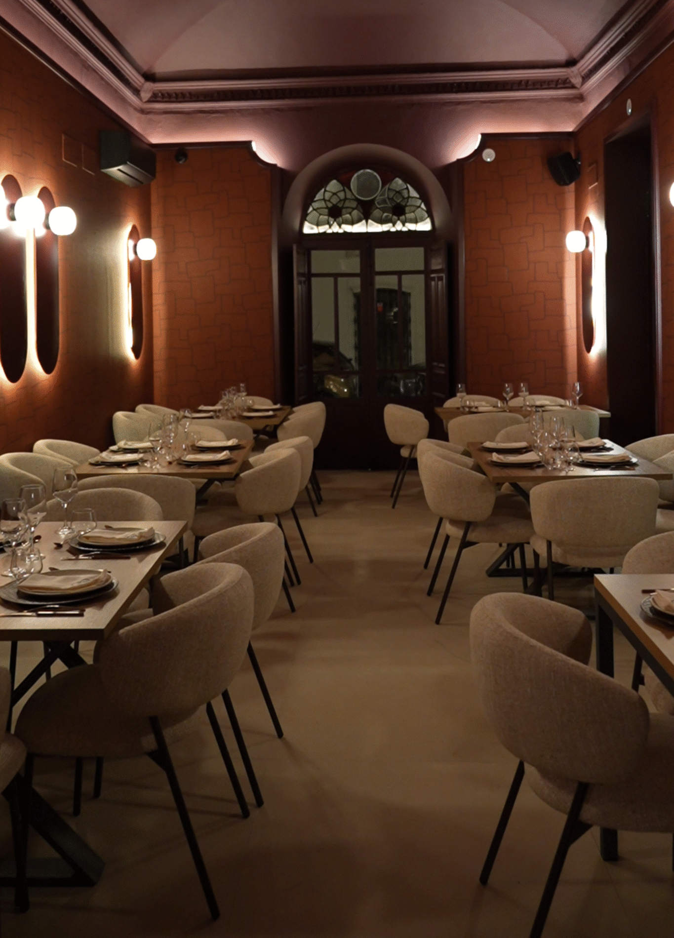 Cada rincón del restaurante refleja la tradición y la elegancia de la arquitectura original, creando un ambiente sobrio y acogedor, ideal tanto para comidas familiares como para reuniones profesionales.